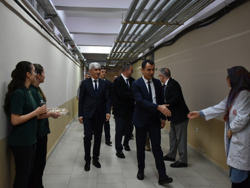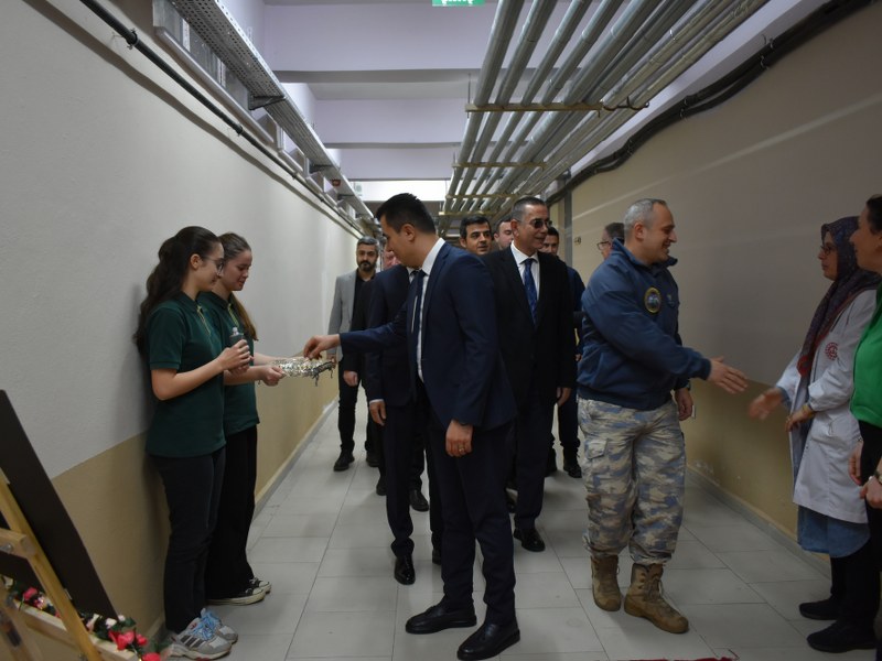 Okul Müdürü, Öğretmenler ve Öğrenciler, İlçe Kaymakamı Hamza İnam ve Protokolü, Fen Lisesi girişinde karşıladılar ve Konferans salonuna kadar eşlik ettiler.