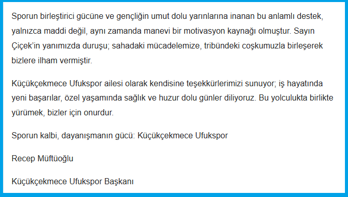 Rize-Pazar’lı İş İnsanı Soner Çiçek ‘in , Kulüp Başkanlığını Pazar’ lı İş İnsanı Recep Müftüoğlu’ nun yaptığı , Küçükçekmece Ufukspor’a yapmış olduğu maddi manevi katkıdan dolayı bir teşekkür ve taktir mesajı yayımladı.