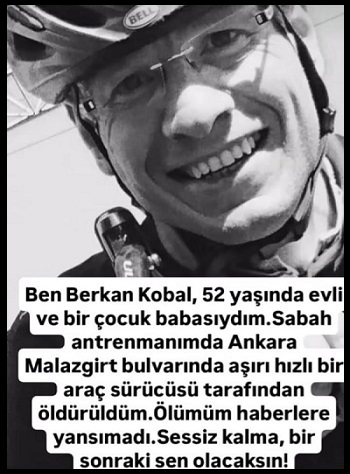 Ankara’da Triatlon sporcusu olan, halamın oğlunun çocuğu, aynı zaman’ da Orhan Kobal’ın yeğeni ve 52 yaşında, bir çocuk babası olan Berkan Kobal; Ankara’ da sabah bisiklet antrenmanı sırasında hızlı gelen, eğitimsiz, cahil ve aşırı hız yapan, şoförün kullandığı bir aracın çarpması sonucu yaşamını yitirdi. Acımız çok büyük.