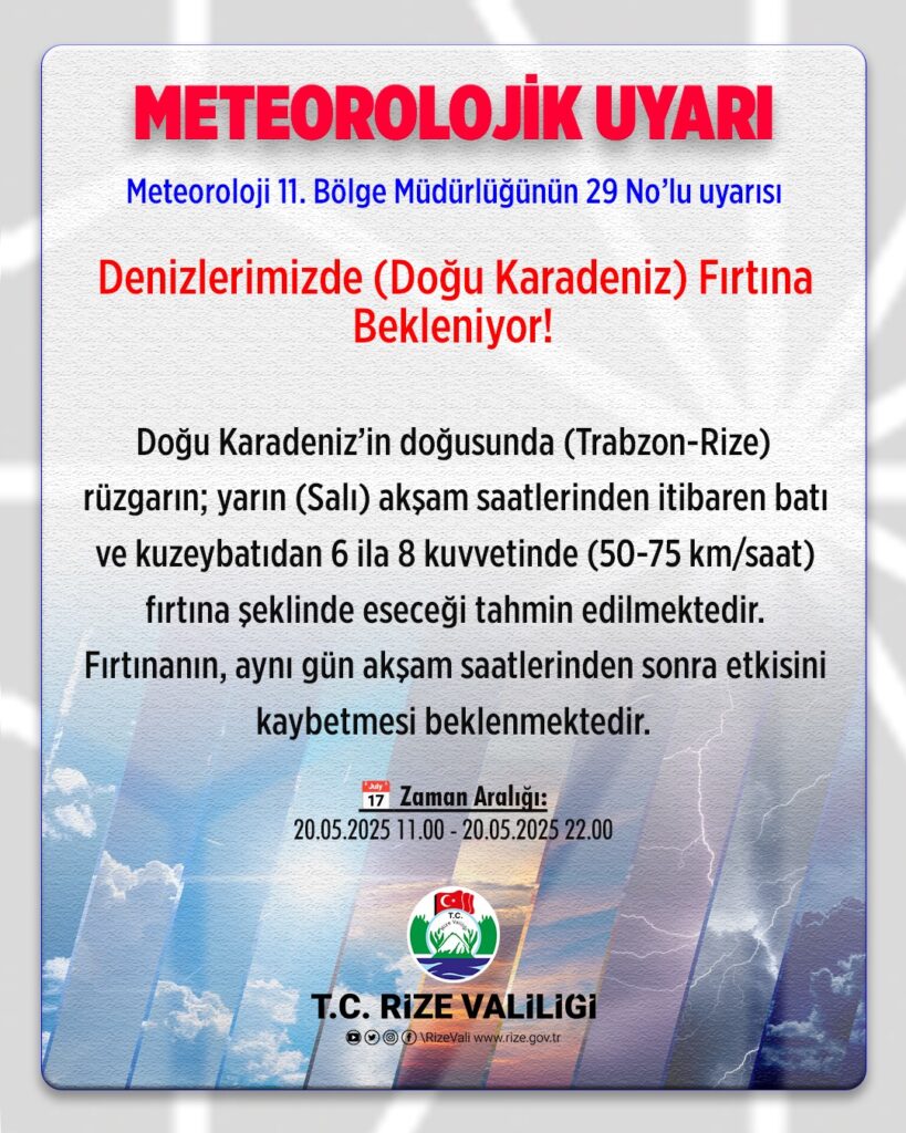 Doğu Karadeniz’in doğusunda (Trabzon-Rize) ise fırtınanın yarın akşam saatlerinden itibaren etkili olması bekleniyor. Rüzgarın yine batı ve kuzeybatıdan 6 ila 8 kuvvetinde (50-75 km/saat) fırtına şeklinde eseceği öngörülüyor. Bu bölgedeki fırtınanın da aynı gün akşam saatlerinden sonra etkisini kaybetmesi bekleniyor. Başlangıç ve bitiş zamanları aynı şekilde 20 Mayıs 2025 saat 11:00 ile 22:00 olarak duyuruldu.