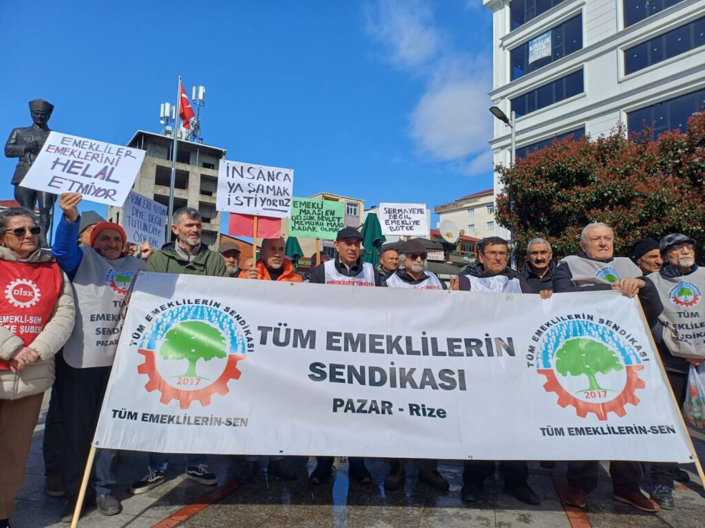 Tüm Emeklilerin Sendikasının Pazar  temsilcileri , Rize- Pazar ‘da, Demokrasi Meydanı’nda, saat 14.00’da, Emeklilerin sesi adına bir basın açıklaması yaptı. Basın açıklamasına Pazar CHP İlçe Başkanı Ömer Hocaoğlu , CHP  Kadın Kolları Temsilcileri, CHP Üyeleri, Belediye CHP  Meclis Üyeleri, Pazar Sol Parti Temsilcileri, Pazar ADD  Üyeleri, Emekliler ve Halk katıldı.