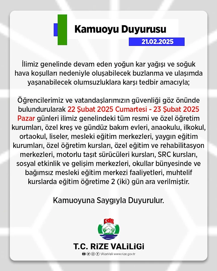 Rize Valiliği Bölgede süren kar yağışı nedeniyle, 22-23-Şubat -2025 Cumartesi ve Pazar günlerin de , tüm resmi, özel öğretim kurumlarında, özel kreş ve gündüz bakım evlerinde, anaokulu, ilkokul, ortaokul, liseler, mesleki eğitim merkezleri ,yaygın eğitim kurumları, özel eğitim kursları, özel eğitim rehabilitasyon merkezlerinde, motorlu taşıt kursları, gibi vs eğitim merkezlerinde eğitim ve öğretime 2 gün ara verildiğini duyurdu.