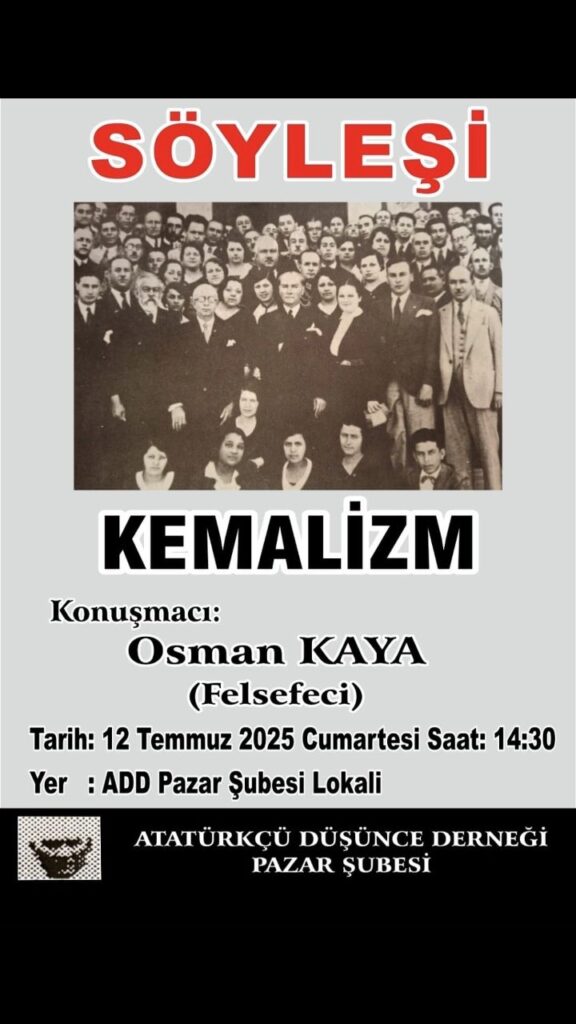 Rize-Pazar ADD, 12 Temmuz 2025 Cumartesi günü, saat 14.30’da ,Pazar Belediyesi İş Hanı Kat 2 ‘de bulunan Dernek Lokalin ‘de, Felsefeci Osman KAYA tarafından sunulan “KEMALİZM” konulu bir söyleşi gerçekleştiriyor.