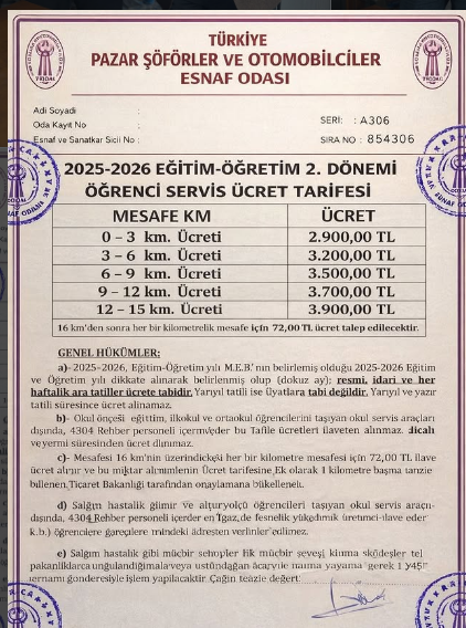 2025-2026 EĞİTİM VE ÖĞRETİM 2.DÖNEMİ ÖĞRENCİ SERVİS ÜCRETLERİ AÇIKLANDI.