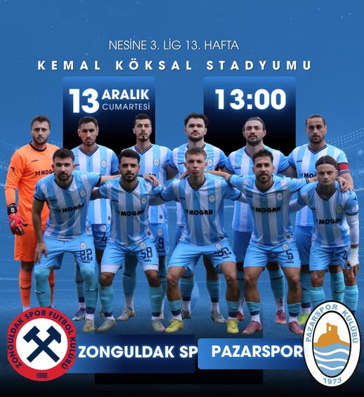TFF Nesine 3. Lig , 3.Grup’ta mücadele veren Pazarspor, 13. hafta karşılaşmasın’da, deplasman’da Zonguldakspor ile zorlu bir maça çıkacak.. Hedef, Zonguldakspor’u yenerek,13. hafta sonun ‘da ,16 puana ulaşıp, puan cetvelinde 8. sıraya yükselmek.