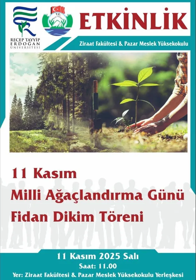 11 Kasım Milli Ağaçlandırma günü nedeniyle, bugün (11.Kasım.2025) salı günü, saat 11.00 ‘da Pazar Meslek Yüksek Okulu Yerleşkesinde, Rize Ziraat Fakültesi tarafından Fidan Dikim Töreni gerçekleşecek.
