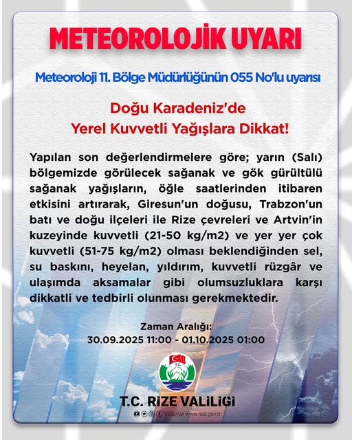 Meteroloji 11. Bölge Müdürlüğü 055 No’lu Uyarıda bulundu.